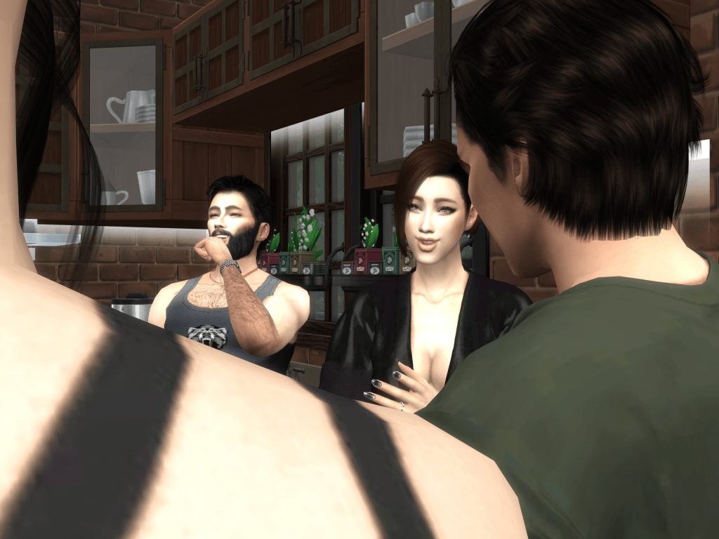 When Bear took the cup from her, their hands brushed, and they shared a knowing smile. Both sets of eyes sparkled, competing with the gleam of their fangs, an unmistakable sign that the transformation was complete, and Bear had finished his basic training as a vampire. Despite the peaceful morning, the playful tension between them remained.