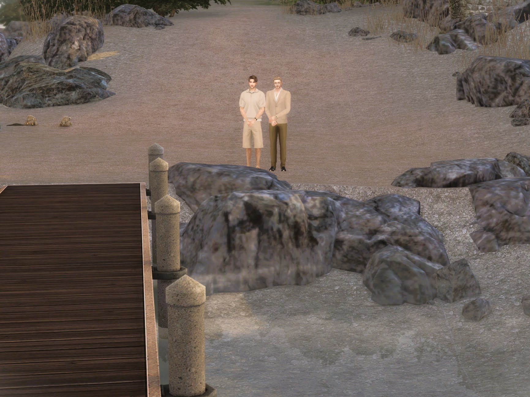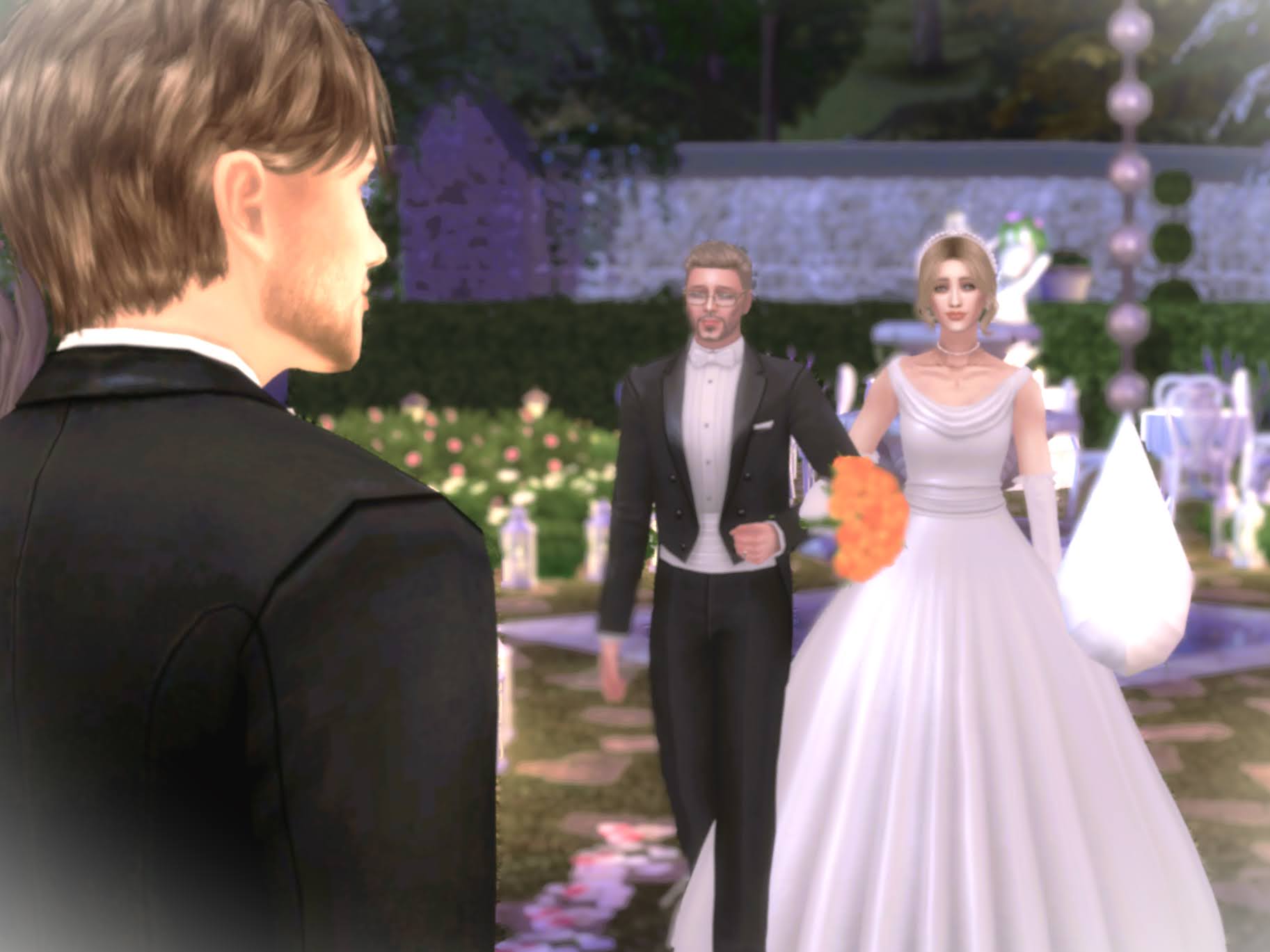 Both of us laughing, he runs off with me, the sound of cheers and well-wishes following us, accompanied by the rhythmic pounding of his footsteps on the gravel path. The scent of fresh grass and blooming flowers fills the air as we move farther away from the crowd.