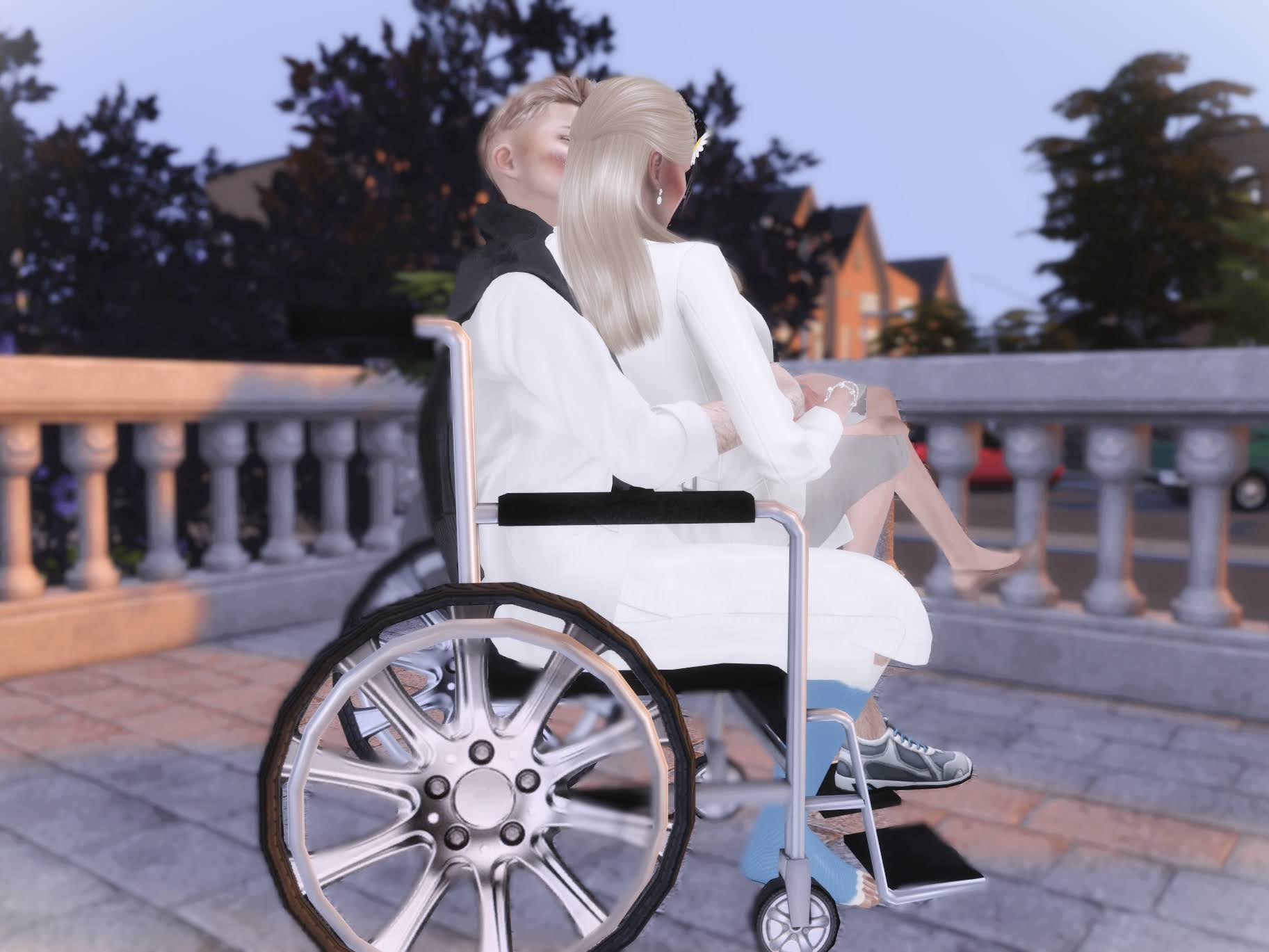 Elias tilted his head, a mischievous grin spreading across his face. Instead of taking the flower, he caught her wrist with surprising speed and strength. With a subtle pull, he drew her into his lap, the wheelchair creaking slightly under the weight. Veronica let out a startled laugh, her blush deepening as Elias leaned forward and kissed her, a gesture both tender and unapologetically bold.