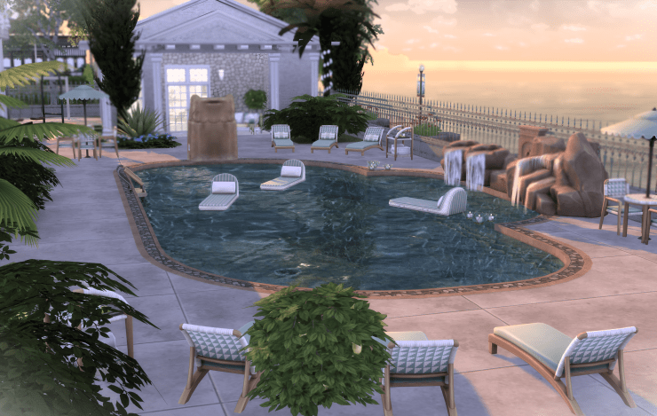 The backyard stretched wide and elegant, a private oasis carved into the cliffs above the ocean. At its heart, a sweeping, resort-style curved pool, its surface dotted with floating loungers that drifted lazily in the golden light. A gentle waterfall feature spilled into the deep end, its soft trickle blending with the hum of conversation and the occasional burst of laughter. Around the pool, multiple seating areas sprawled across the stone patio—plush sectionals, cushioned chaises, and shaded tables perfect for lingering over drinks. Lush greenery framed the space: manicured hedges, flowering vines, and tall palms that swayed gently in the coastal breeze. The air smelled of salt, citrus, and something faintly floral.