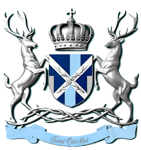 - Crest: A celeste shield featuring two rampant silver stags flanking a Nordic-style crown, with intertwining silver branches at the base. Beneath the shield is a banner with the motto “Trohet och Mod” (Loyalty and Courage).